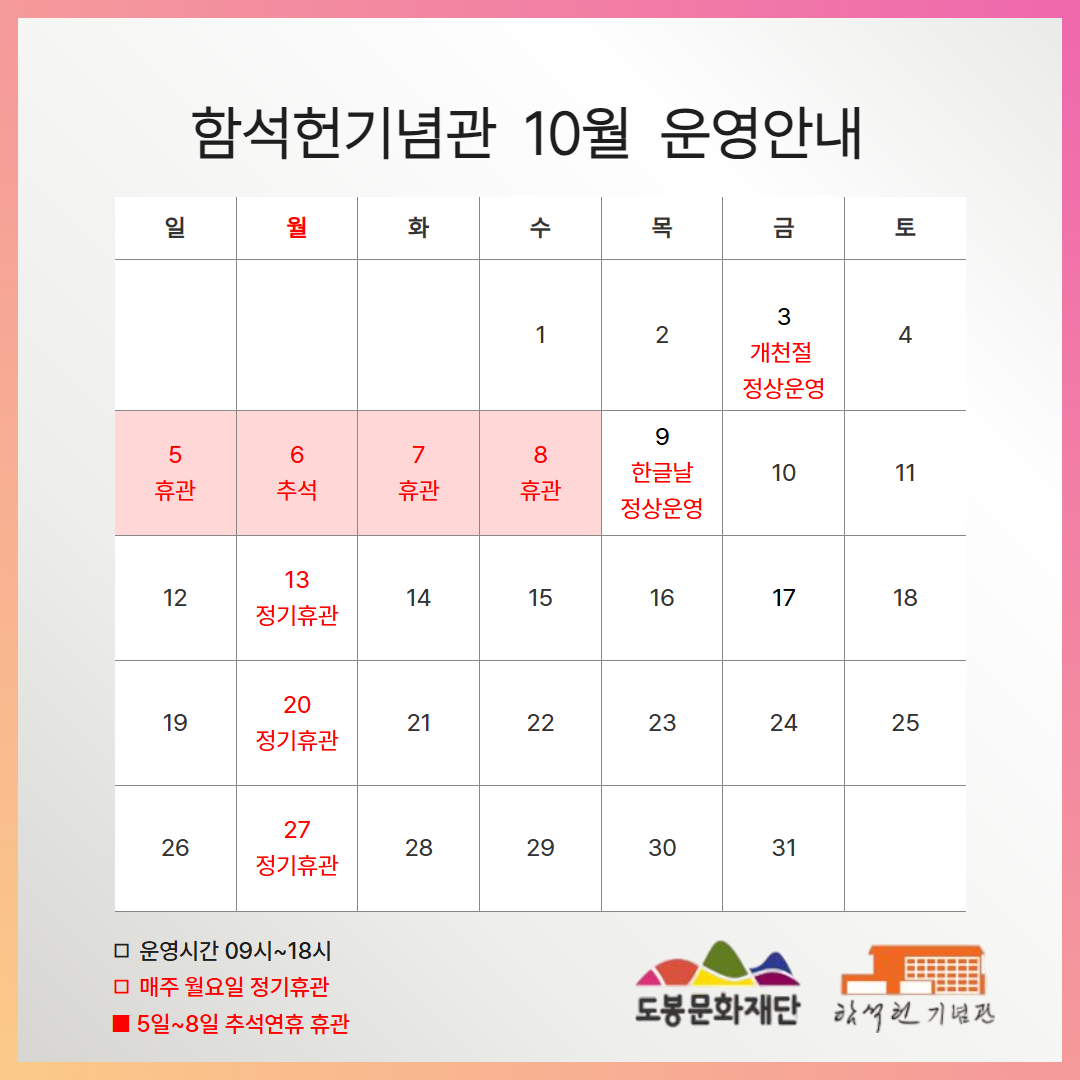 (재)도봉문화재단 함석헌기념관 기념관 소개 기념관 시설현황 관람안내 오시는길 함석헌 소개 함석헌 소개 함석헌 연보 아카이브 소장유물 함석헌 저서 영상자료 대관 공간소개 대관신청 커뮤니티 공지사항 보도자료 포토갤러리 온라인 기념관 기획전시실 상설전시실 (재)도봉문화재단 함석헌기념관 기념관 소개 - 기념관 - 시설현황 - 관람안내 - 오시는길 함석헌 소개 - 함석헌 소개 - 함석헌 연보 아카이브 - 소장유물 - 함석헌 저서 - 영상자료 대관 - 공간소개 - 대관신청 커뮤니티 - 공지사항 - 보도자료 - 포토갤러리 온라인 기념관 - 기획전시실 - 상설전시실 커뮤니티 홈 커뮤니티 공지사항 공지사항 공지사항 보도자료 포토갤러리 함석헌기념관 2025년 10월 운영 일정 안내 2025-09-26 함석헌기념관 함석헌기념관 10월 운영일정을 안내해드리오니 방문에 참고하시길 바랍니다.- 매주 월요일 정기휴관- 관람시간 09:00~18:00- 문의 02) 905-7007 썸네일 2025년 10월 함석헌기념관 운영 안내 이미지.jpg (대표) 첨부파일 2025년 10월 함석헌기념관 운영 안내 이미지.jpg 목록 이전글2025년 주민참여프로그램 '詩월의 문학' 안내 다음글2025년 함석헌기념관 씨알갤러리 하반기 5차 대관 전시 안내