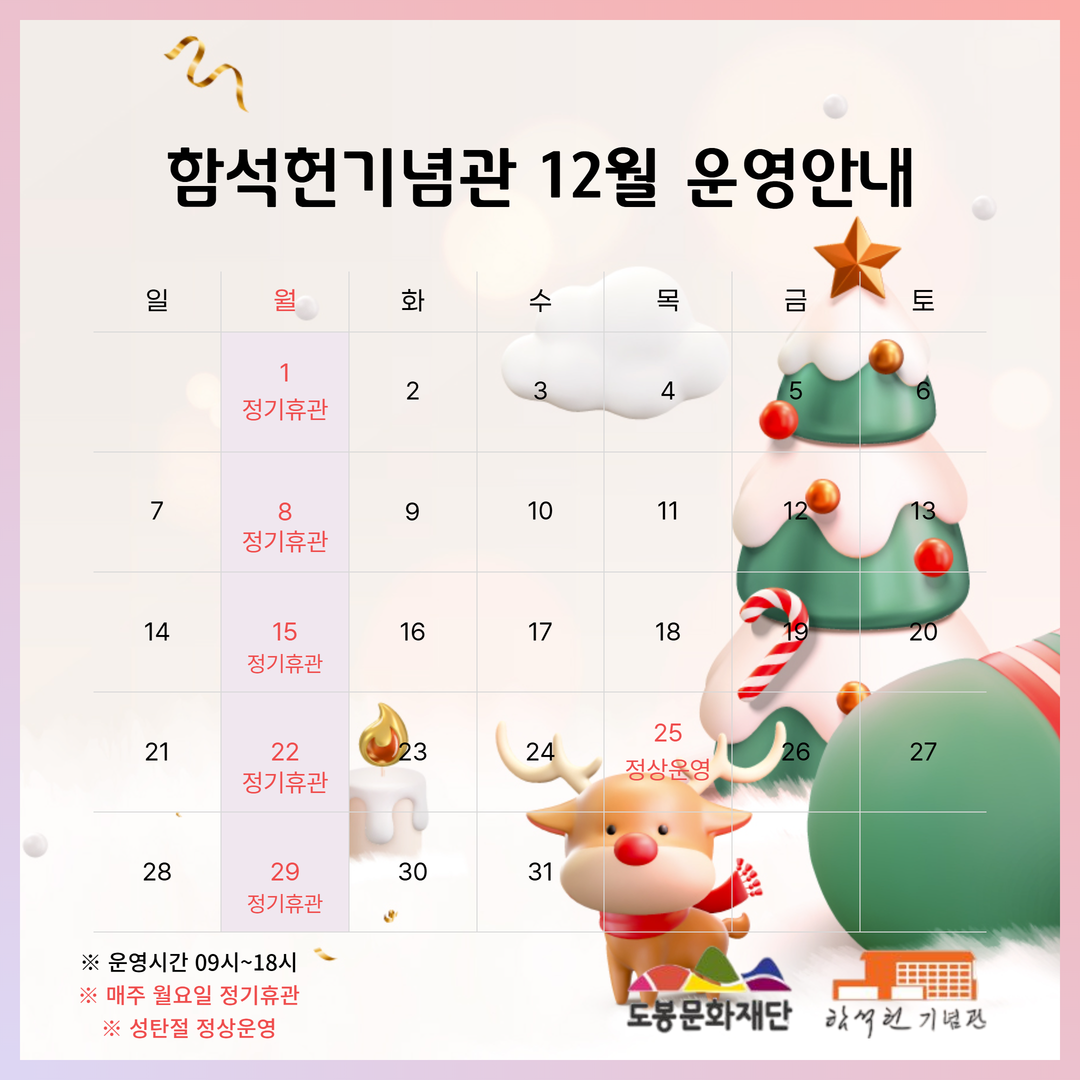 함석헌기념관 12월 운영일정을 안내해드리오니 방문에 참고하시길 바랍니다.