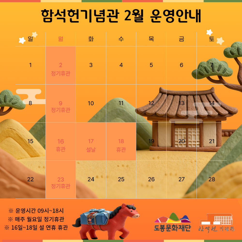 함석헌기념관 2월 운영일정을 안내해드리오니 방문에 참고하시길 바랍니다.